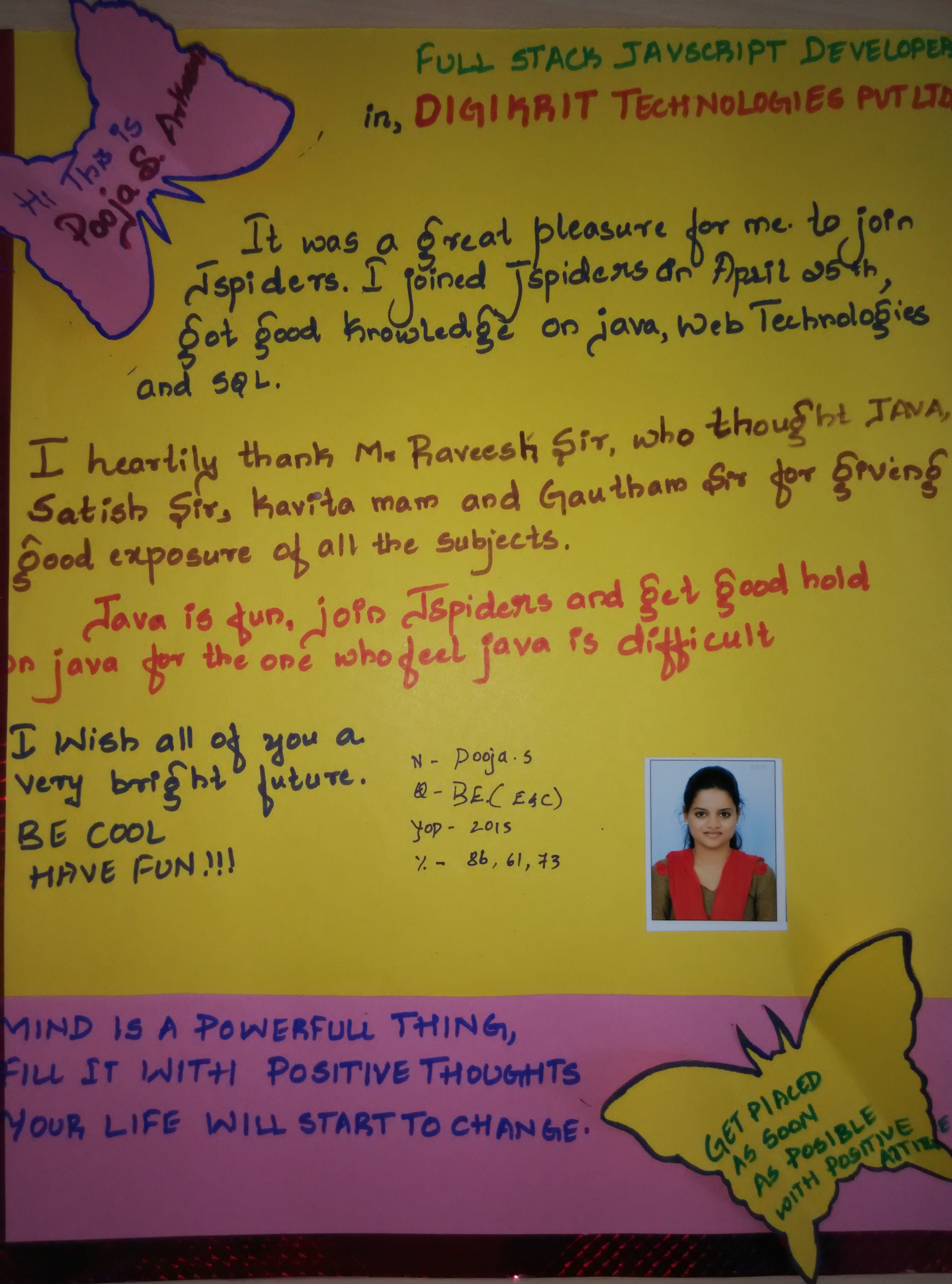 It was a great pleasure for me to join Jspiders. I joined Jspiders in April 25th, got good knowledge on Java, web Technologies and SQL.