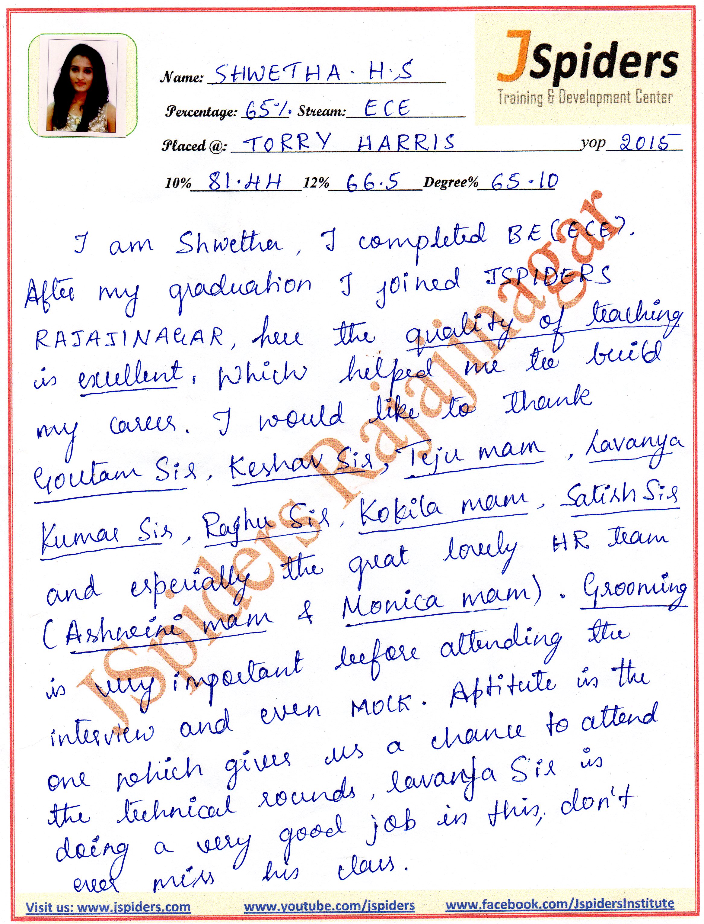 I am Shwetha, i completed BE (ECE). After my graduation i joined JSPIDERS RAJAJINAGAR, here the quality of teaching is excellent, which helped me to build my carreer. I would like to thank Goutham sir, Keshav sir, Teju mam, Lavanya sir, Raghu sir, Kokeela mam, Sathish sir and especially the great lovely HR team (Ashwini mam and Monica mam). Grooming is very important before attending the interview and even mock. Aptitude is the one which gives us a chance to attend the technical rounds, Lavanya sir is doing a very good job in this, don't ever miss his class..